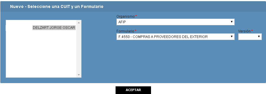 El Sistema despliega la ventana Nuevo Formulario, deberemos seleccionar el CUIT, Seleccionamos el Organismo AFIP, el Formulario F.4550 – Compras a Proveedores del Exterior y presionamos aceptar.
